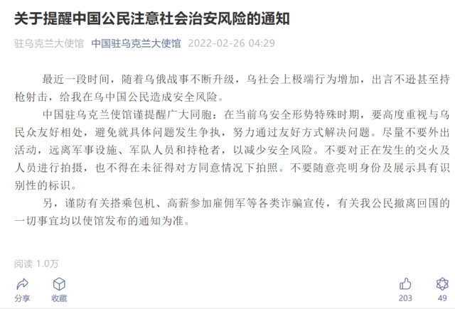 中国驻乌克兰使馆谨提醒广大同胞:在当前乌安全形势特殊时期,要高度重视与乌民众友好相处,避免就具体问题发生争执,努力通过友好方式解决问题。尽量不要外出活动,远离军事设施、军队人员和持枪者,以减少安全风险。不要对正在发生的交火及人员进行拍摄,也不得在未征得对方同意情况下拍照。不要随意亮明身份及展示具有识别性的标识。